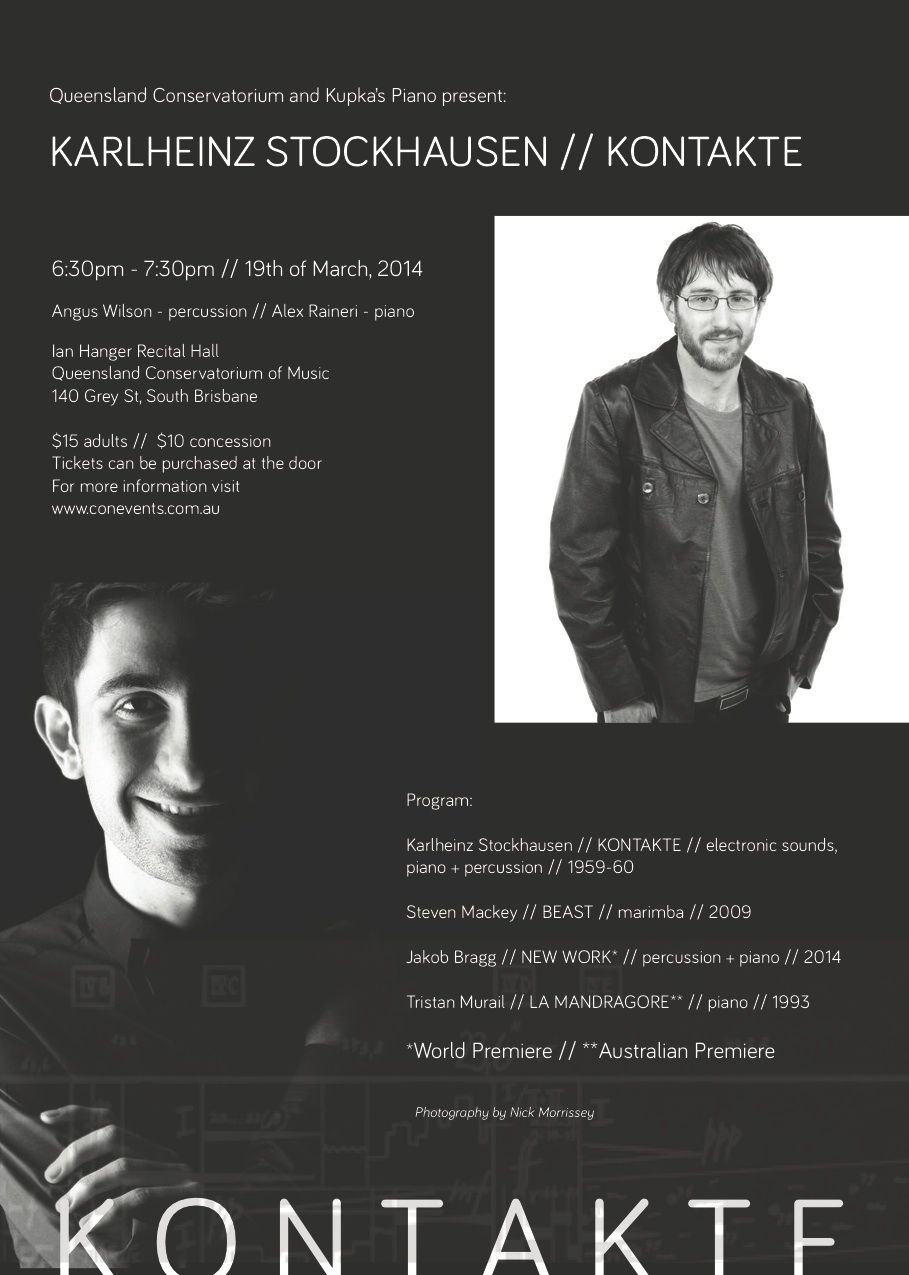 September 26th will see a new concert by the Corrade Collection at the Queensland Conservatorium. Corrade is Amanda Terry (violin), Caleb Colledge (percussion) & Michael Louttit (double bass/electronics) who are joined by a host of talented musicians performing a truly unique, cross artform concert. As of next week I’ll begin work on a piece for act 6 of this ‘multifaceted art/music/drama work’, utilising violin, viola, double bass, percussion, piano and flute. Envisioned and directed by Amanda Terry, this striking and challenging creation will see 7 acts cross the spectrum of genre, style, intensity and pysche; a production that can only be adequately described as a true Gesamtkunstwerk.